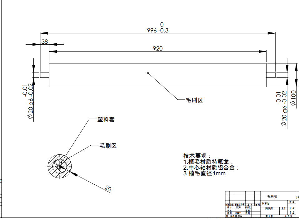 然後(hòu)說下直徑的概念,直(zhí)徑分為總的直徑,總的直徑就是加上毛(máo)刷的長度,整個的寬度一樣。軸心的直徑和製作但是其他的特征如圖紙所標(biāo)識的20mm所以圖(tú)紙所提供的就是毛刷的整(zhěng)體的製作。然後就是分工